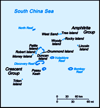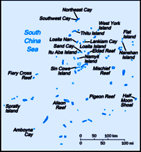 The Spratly Islands are a group of more than 100 reefs and islands in the South China Sea between the Philippines and Vietnam. Various claims by all surrounding nations.