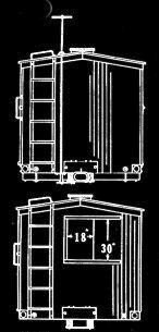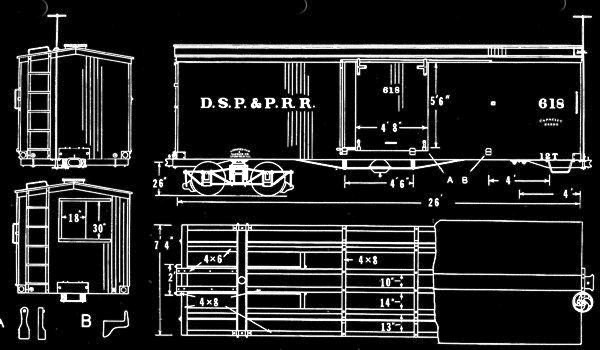 Like most railways, the DSP&P roster was dominated by boxcars, nearly 600 of them, delivered in 12 orders across 11 years. Many did not survive the rigors of rough service but a fair number made it to the C&S era.. All were painted oxide red with white lettering on sides and ends. They had double-board wood roof. Many had a small door in one end for loading lumber. Many had ladders on the right end of each side; some had hand grabs. There were no steps and no grabs on the left. A few older cars had a ladder on each end wall and nothing on the sides, so there was lots of variety.