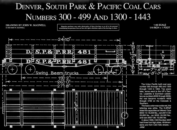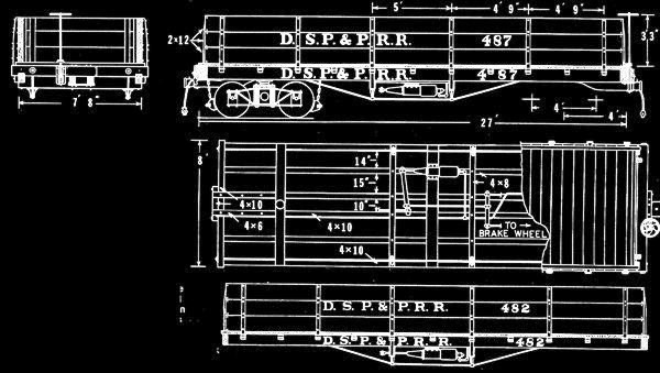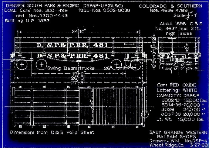 The first 5 coal cars were made from some of the 1874 Hallack flat cars with added side boards. A larger but unknown number of the 1879 DSP&P #100 to 299 series flat cars also had side boards and were renumbered in 1885 in the DSP&P coal car series #8000 to 8038.