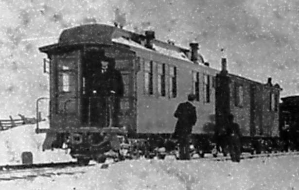 DL&G business car #O25 at Atlantic siding, 17 Mar 1898. Trucks are Commonwealth passenger car type.