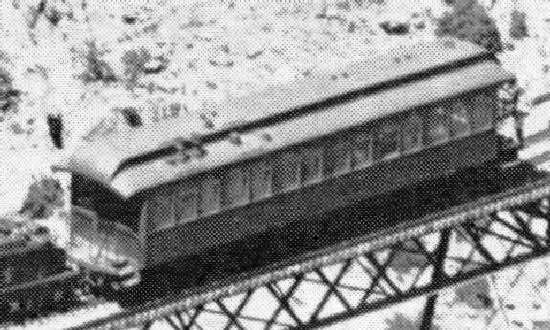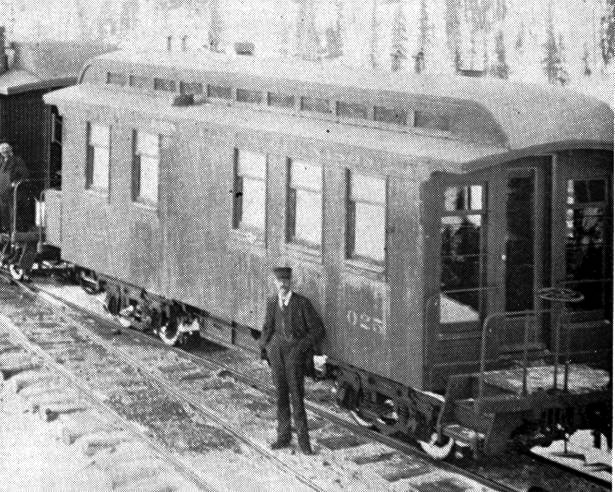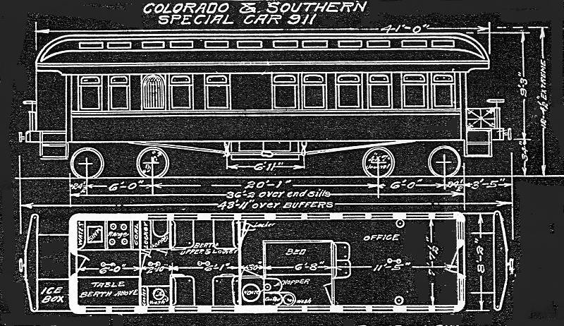 C&S business car #911 was mounted on standard gauge trucks from time to time. Notice how much smaller it is than the preceding car, and the extension steps. Here it appears to be in use as an inspection car being pushed down the line. Note the huge observation windows and the rear view mirror.