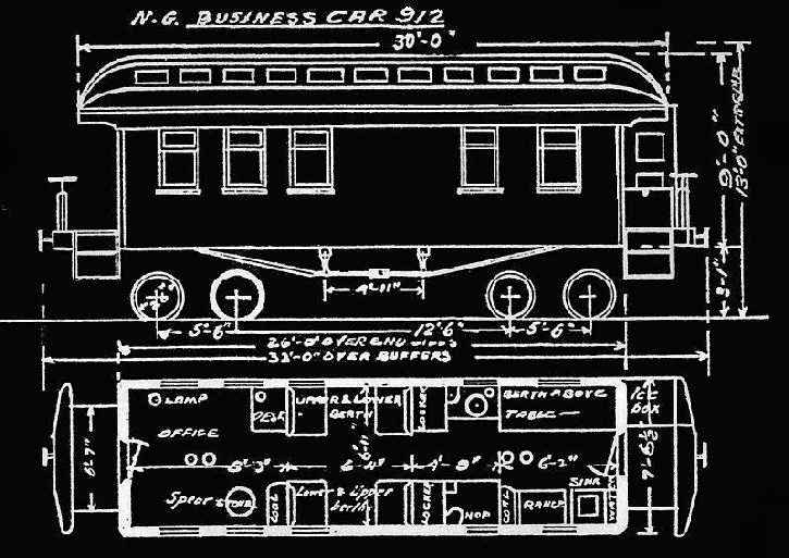 Officer Car #O25 (2nd) was built from a 26 foot boxcar with platforms added on both ends, and a clerestory roof installed. It was under 7'-0" wide inside and was rated to carry 5 adults. Large windows flanked the door at the office end but there were no windows on the kitchen end. Its purpose is uncertain, likely on-line business rather  than to entertain visiting dignitaries.